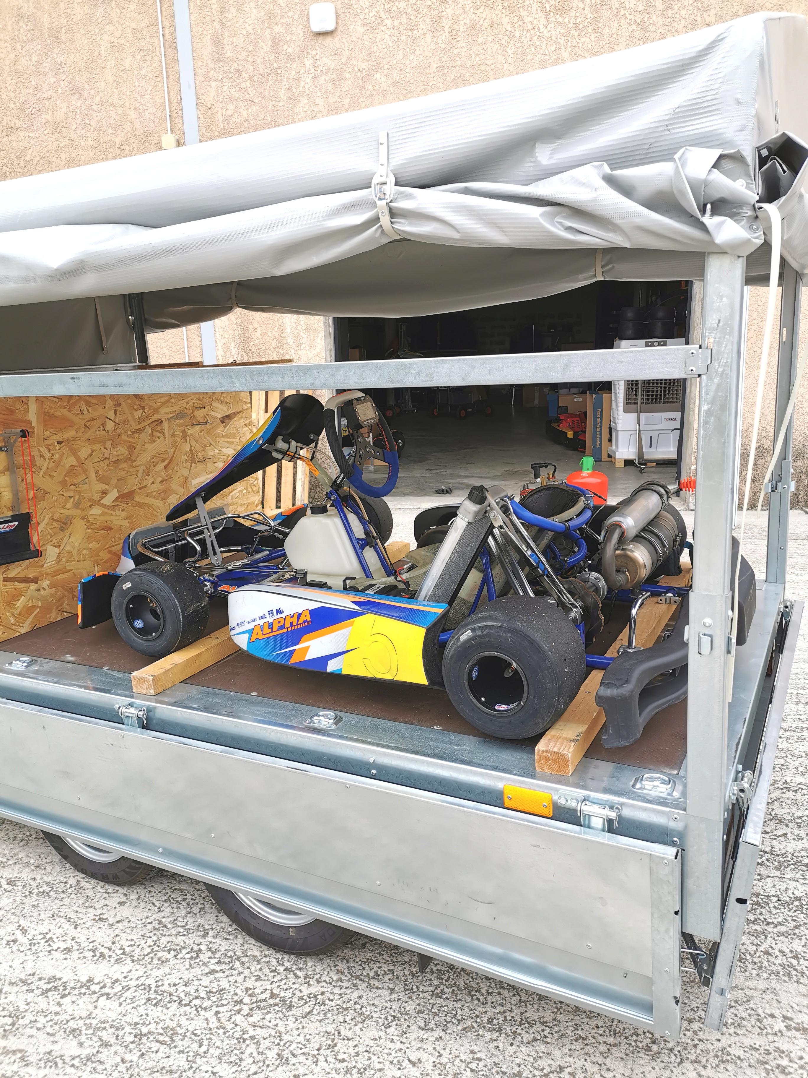 Notre magasin SEB POWER KARTING sur Grans, vous propose à la vente cette remorque d’occasion, bâchée, aménagée pour le karting, au tarif de 2400 Euros ttc.
