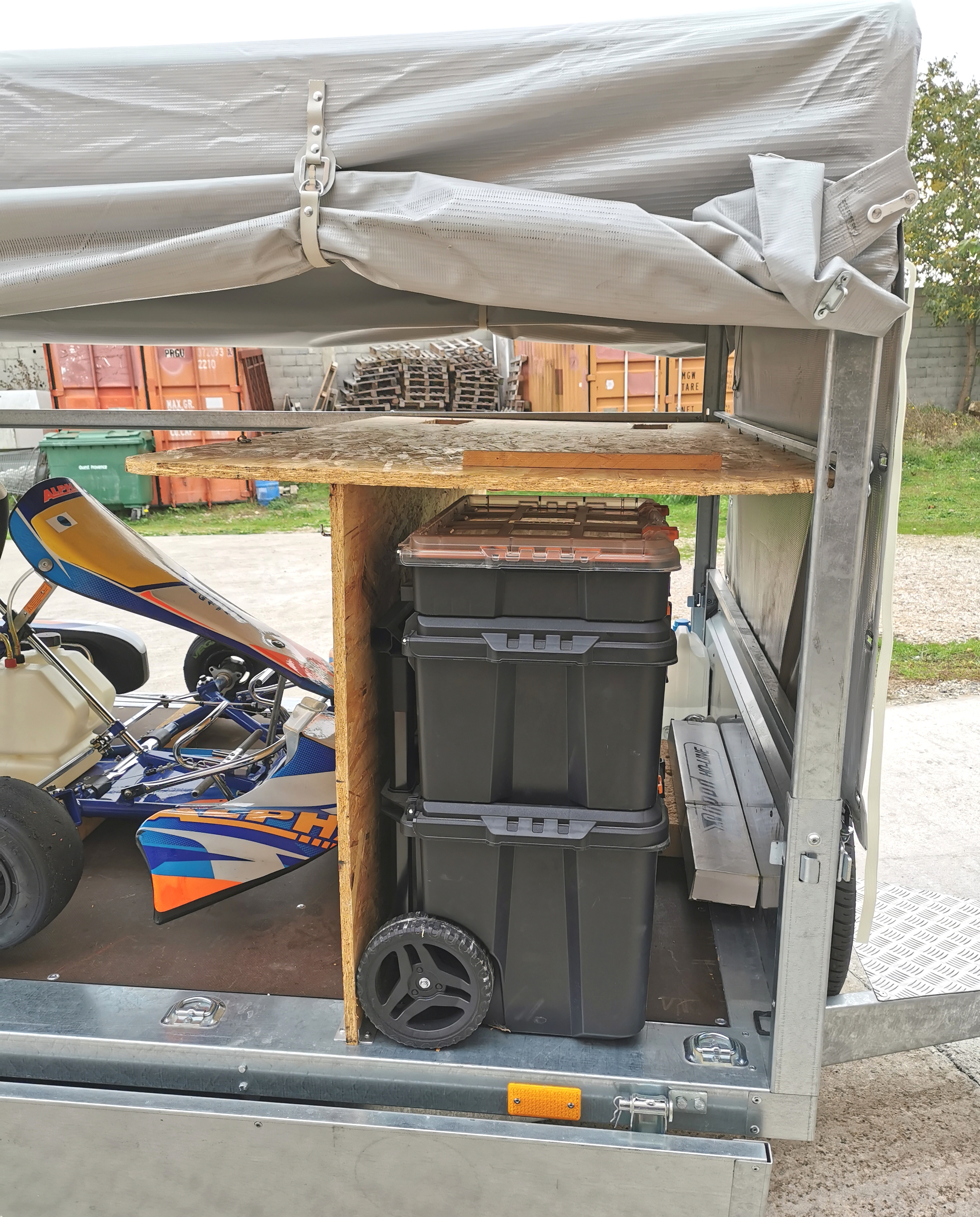 – Aménagée pour rentrer un kart adulte sans problème, un chariot de piste (tous modèles), caisses, bidons, etc…